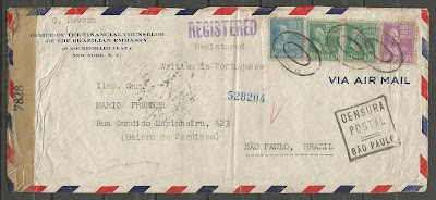 Durante a Segunda Guerra Mundial (1939 - 1945), existiram nos Estados Unidos, serviços de censura postal civil e militar. Interessa para esta postagem, a primeira, coordenada naquele país pelo Escritório de Censura. Ao todo, existiram 18 estações de censura postal, entre as quais em Nova Iorque [1], onde o censor 7828 verificou a correspondência destinada ao Sr. Prugner.