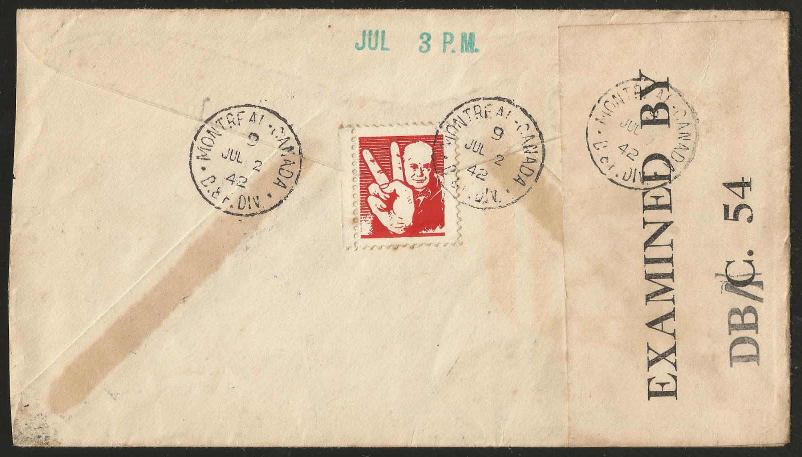 Ainda em Montreal, foi fixada uma cinderela de propaganda de guerra sobre o verso do envelope. Nela, foi impressa uma imagem do então primeiro-ministro britânico Winston Churchill (1874 - 1965), com o seu tradicional gesto do "V" de vitória. Durante a Segunda Guerra Mundial (1939 - 1945), o "V" foi usado tanto pelos Aliados quanto pelo Eixo, como por exemplo, os "V-Stempel" alemães aplicados sobre bilhetes, cartões e envelopes circulados. Ou, durante o contexto de ocupação da Holanda, o uso da letra "V" como um dos símbolos da resistência holandesa [1].